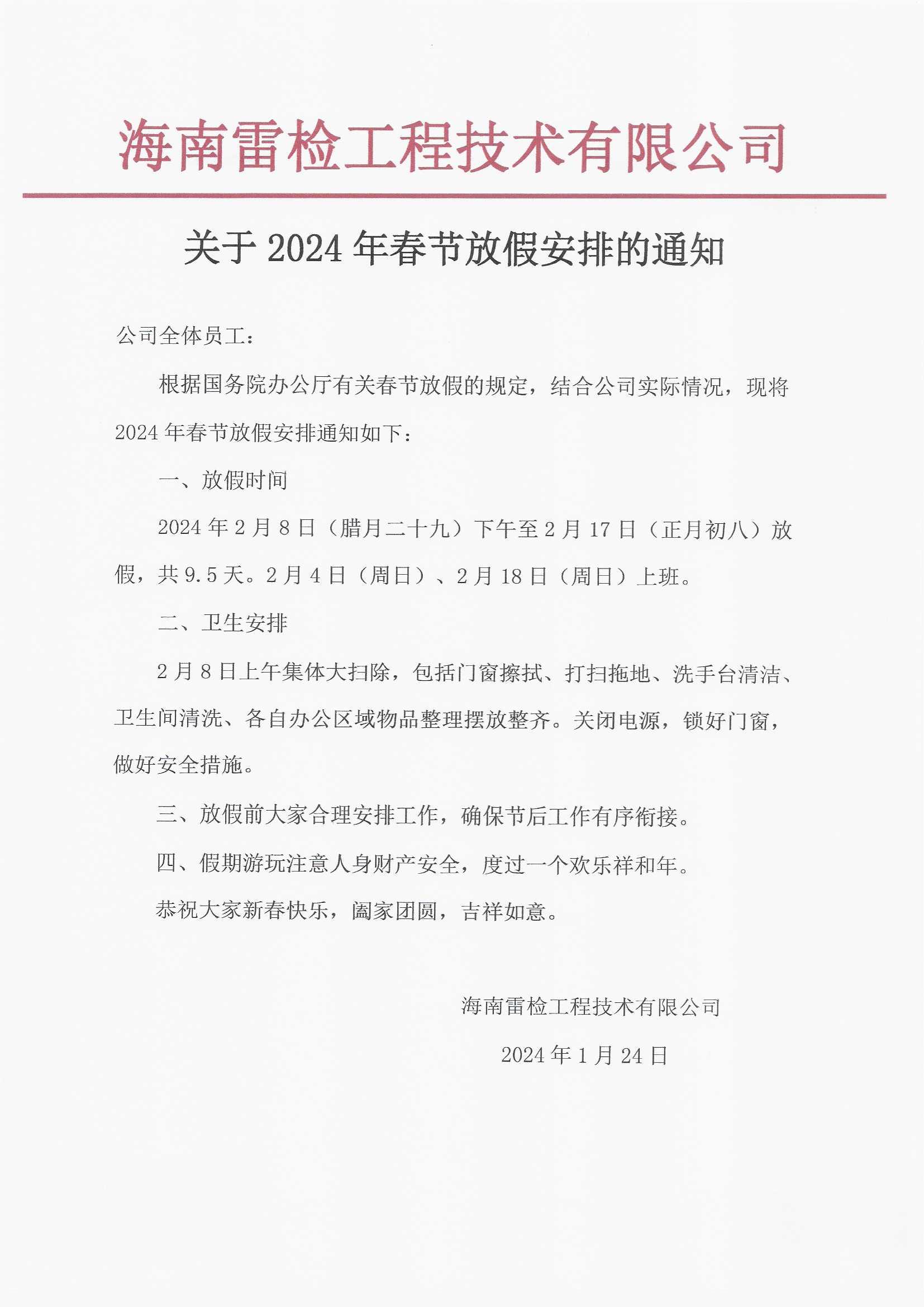關(guān)于2024年春節(jié)放假安排的通知