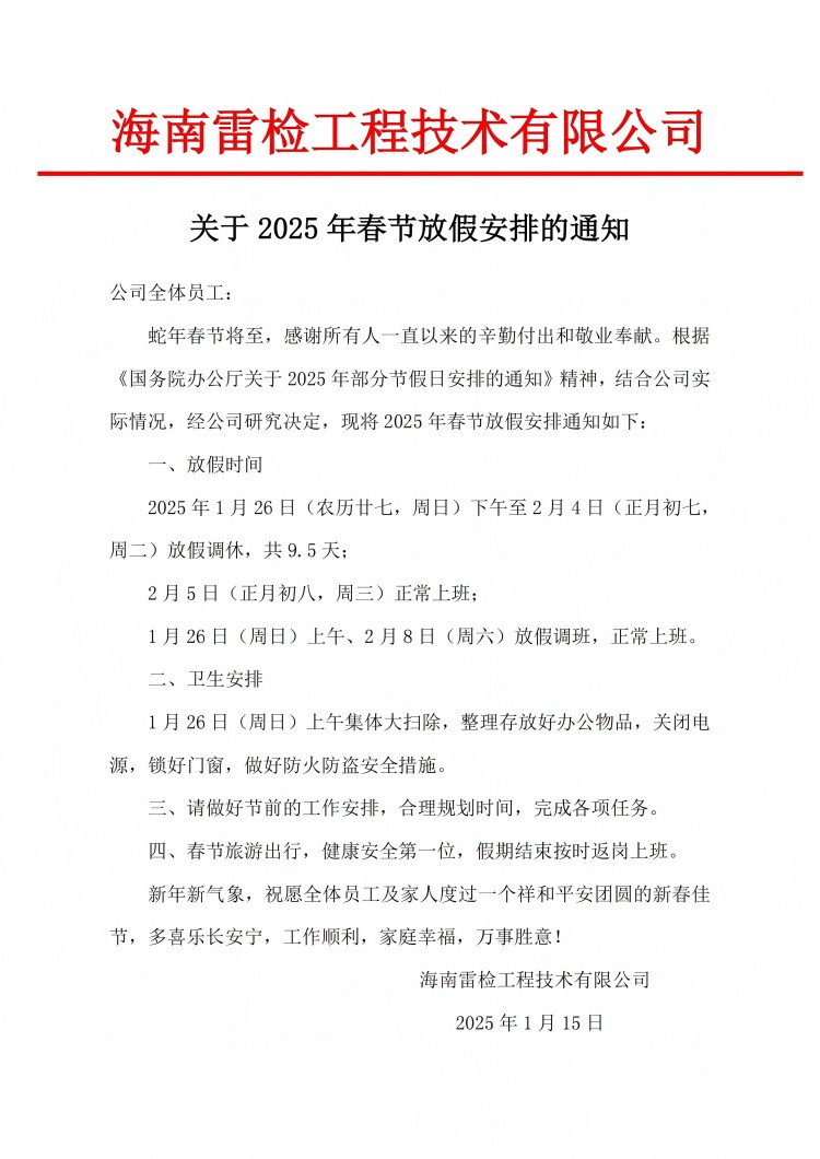 關于2025年春節放假安排的通知