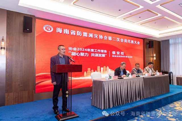 隨后,海南省防雷減災協會會長侯安校向大會作了2024年度協會工作報告。報告中,他表示,2025年,協會將嚴格履行省局各項委托職責,配合省局加快信用評價體系建設,引導行業向誠信經營、質量引領轉型。針對行業現存短板,將持續完善“自律監督小組+會員共治”機制,攜手全體會員單位,共同推動防雷減災工作跨上新臺階,為海南自貿港建設筑起堅實的防雷屏障。