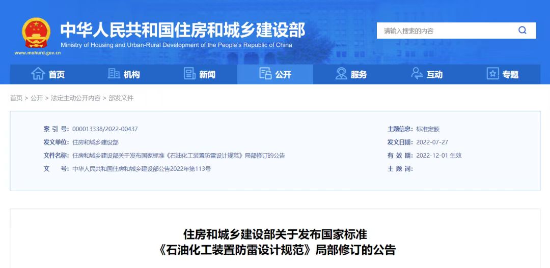 現批準國家標準《石油化工裝置防雷設計規范》(GB50650-2011)局部修訂的條文,自2022年12月1日起實施。經此次修改的原條文同時廢止。