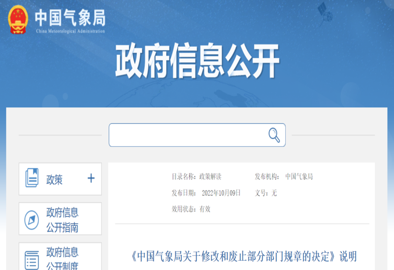 2021年8月,中國(guó)氣象局發(fā)函征求各省(區(qū)、市)氣象局意見(jiàn),同時(shí)通過(guò)司法部立法征求意見(jiàn)系統(tǒng)和中國(guó)氣象局官網(wǎng)面向社會(huì)公開(kāi)征求意見(jiàn),均無(wú)修改意見(jiàn)。7月29日,經(jīng)中國(guó)氣象局局務(wù)會(huì)議審議通過(guò),決定廢止該《辦法》。