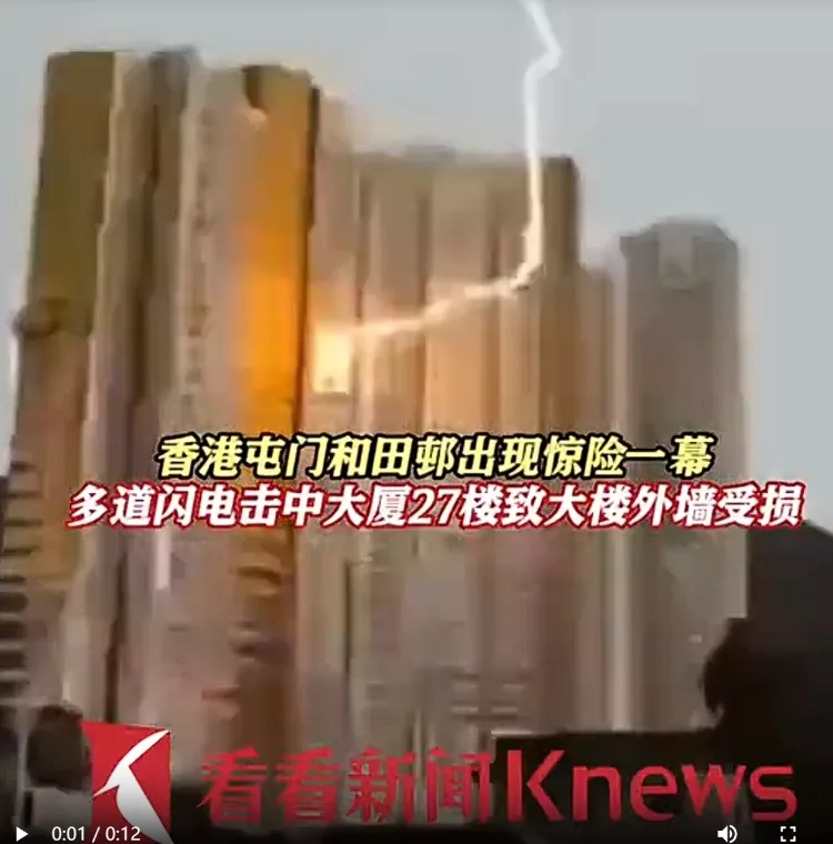 2023年6月1日凌晨,香港屯門和田邨地區雷電交加,其中一棟大廈被雷電劈中。從網友上傳視頻和圖片可見,有閃電“轉彎”擊中一棟高層建筑,電光連閃3次,爆出火光,并伴隨巨大雷響。幸運的是,只有該單建筑窗臺一角被雷電擊毀,沒有更多損失,也沒有人受傷。