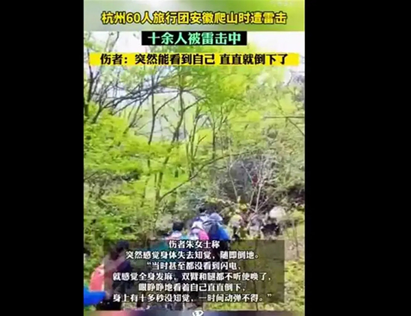 類似戶外人群遭雷擊的事件并不少見。去年5月28日,杭州一批60余人旅行團(tuán)前往安徽旅游,在爬山過(guò)程中遭到雷擊,有10多人受傷,其中3名年輕女性受傷嚴(yán)重,被緊急送醫(yī)。