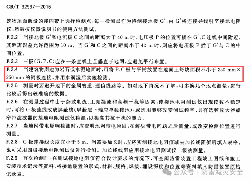 防雷檢測現場常遇一難題:被檢測單位地面已全部硬化,水泥、瀝青等材質導致防雷接地測試極(P 極、C 極)無法按常規方式打入地下,直接阻礙檢測工作推進。事實上,這一問題的解決方法早已在國家標準中明確。根據GB/T 32937-2016《爆炸和火災危險場所防雷裝置檢測技術規范》附錄 F2.4規定:當建筑物周邊為巖石或水泥等硬化地面時,可采用替代方案實施檢測。具體操作方法為:將 P 極、C 極分別與兩塊鋼板連接,鋼板需平鋪在地面上,且單塊鋼板面積不小于250mm×250mm;連接完成后,用水潤濕鋼板與地面的接觸面,即可正常開展接地電阻檢測。該方法無需破壞硬化地面,既保證檢測合規性,又兼顧現場實操性。