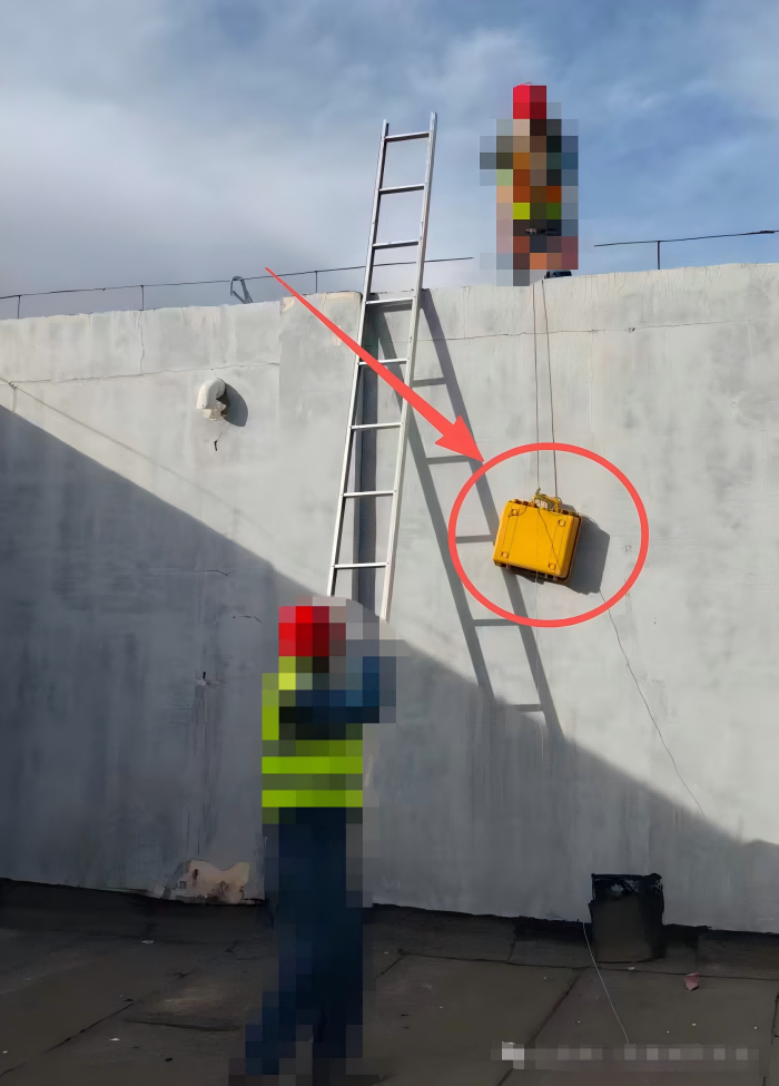雷電防護(hù)裝置檢測(cè)中有時(shí)候需要將檢測(cè)設(shè)備拿到高處作業(yè),如對(duì)接閃帶和引下線之間的過渡電阻檢測(cè)、或者鉗形表對(duì)接閃帶導(dǎo)通性能進(jìn)行測(cè)試。但設(shè)備如何安全的傳遞到高處了,也是安全作業(yè)需要考慮的內(nèi)容。如上圖中使用檢測(cè)線綁上檢測(cè)設(shè)備由高處人員拉上去的情況是存在一定安全隱患的,也是不符合防雷檢測(cè)作業(yè)安全要求的,有可能檢測(cè)線斷裂后設(shè)備墜落地面造成設(shè)備損壞或者是對(duì)低處人員造成傷害。按照《雷電防護(hù)裝置檢測(cè)作業(yè)安全規(guī)范》(QX∕T 560-2020)5.7要求,檢測(cè)所需的儀器、工具和輔材,應(yīng)使用繩子傳遞或裝入工具袋(包)隨身攜帶,不應(yīng)拋擲,使用繩子傳遞時(shí)應(yīng)避開架空供電線路。